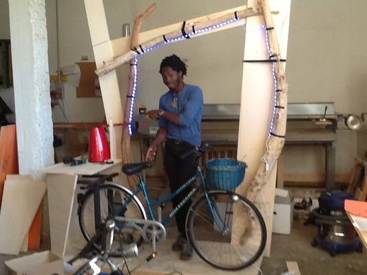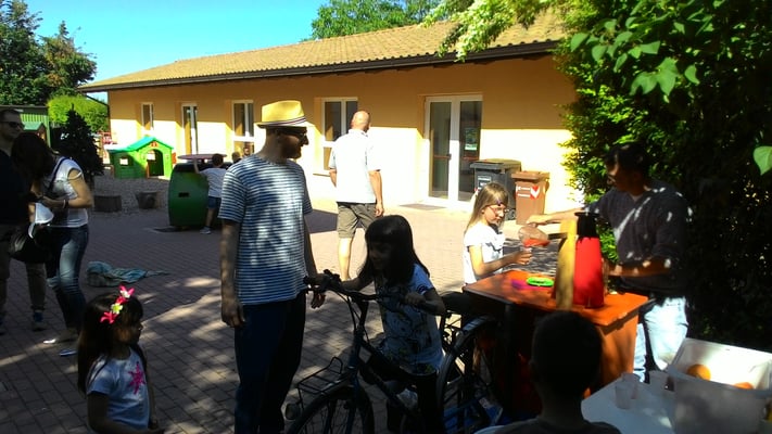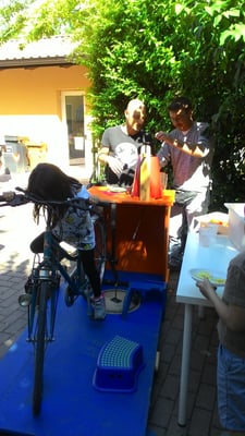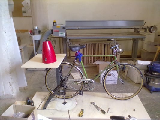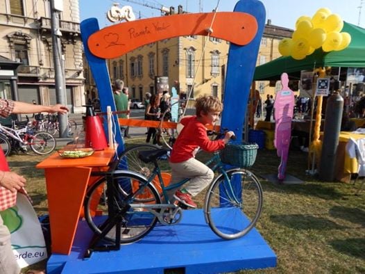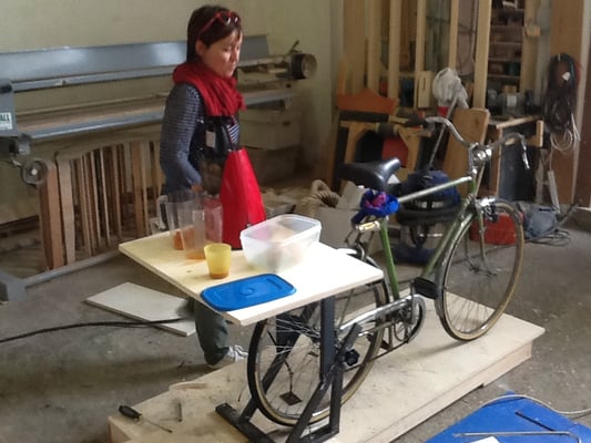 Pedalando attivi un'estrattore di frutta e produci il succo !!! gioco eco meccanico e semplicemente intrigante! La ruota della bicicletta fa girare una puleggia su ruote , questa trasmette il moto tramite un'albero all'asse dell'estrattore che spreme la frutta e la verdura , lentamente e offrendo un succo ottimo con tutte le vitamine e le proprietà della frutta.