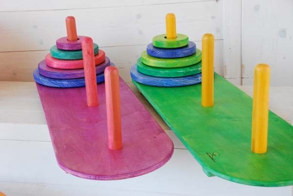Partendo con i cerchi disposti su una pila dal più piccolo al piùgrande, spostali tutti disponendoli da una bastone all'altro uno per volta sempre dal più grande al più piccolo, fino a rimetterli tutti in ordine.
